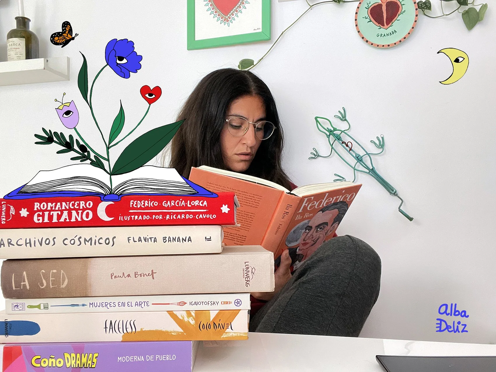 Alba Deliz es una artista e ilustradora profesional, muy amiga de Dorado Vintage. Después de intercambiar conversaciones, fotos, opiniones...decidimos lanzar esta prenda única y hacer magia con ella!